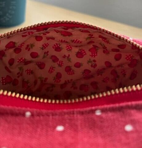 表地は赤のドット柄で裏地はいちご柄です。
